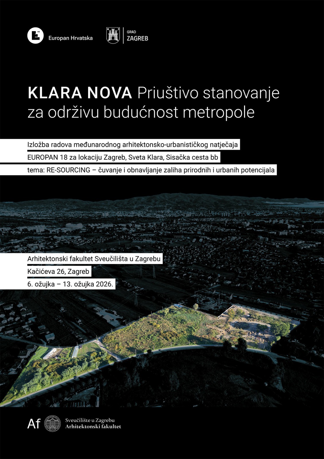 Europan Hrvatska i Grad Zagreb imaju čast i zadovoljstvo pozvati Vas na otvorenje izložbe radova međunarodnog arhitektonsko-urbanističkog natječaja ciklusa EUROPAN 18 na lokaciji Sveta Klara, s temom RE-SOURCING, čuvanje i obnavljanje zaliha prirodnih i urbanih potencijala.